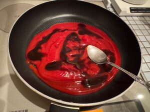 そしたら、フライパンに適当にケチャップを入れて、